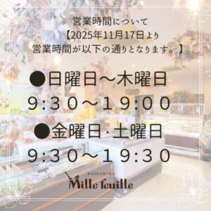 新鮮で上質な素材をふんだんに使った味わいのお菓子や個性的なケーキ、みずみずしい光沢のあるケーキ、濃厚な味、食べやすく見た目も可愛らしいもの等それぞれの個性の中でおいしいを追及しています。パティシエが心を込めて創ったケーキ、ミルフィユオリジナルのお菓子、季節限定のスイーツなど、一つ一つ心を込めて作っています。