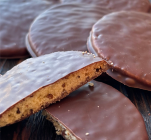 そばの実入りのクッキーにマイルドな口どけのミルクチョコレートをコーティングしたミルクチョコクッキー